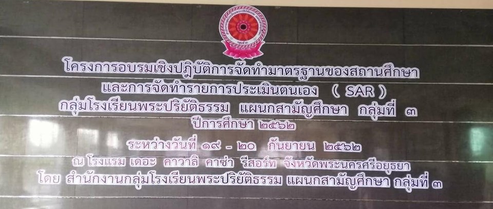 พระครูกาญจนสุตาภรณ์ ผู้อำนวยการโรงเรียน ได้มอบหมายให้นางวาสนา หลงสมบุญ รองผู้อำนวยการโรงเรียนและครูนิศรา ศิลาวงษ์ ฝ่ายวิชาการของโรงเรียน เข้าร่วมโครงการอบรมเชิงปฏิบัติการจัดทำมาตรฐานการศึกษา และจัดทำรายงานประเมินตนเอง (SAR) กลุ่มโรงเรียนพระปริยัติธรรม แผนกสามัญศึกษา กลุ่มที่ ๓ ปีการศึกษา ๒๕๖๒ ในรหว่างวันที่ ๑๙-๒๐ กันยายน พ.ศ.๒๕๖๒ ณ โรงแรมเดอะคาวาลิคาซ่ารีสอร์ท จังหวัดพระนครศรีอยุธยา โดยสำนักกลุ่มโรงเรียนพระปริยัติธรรม แผนกสามัญศึกษากลุมที่ ๓ |