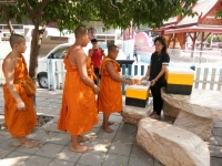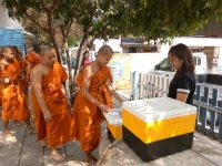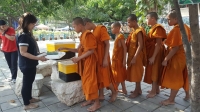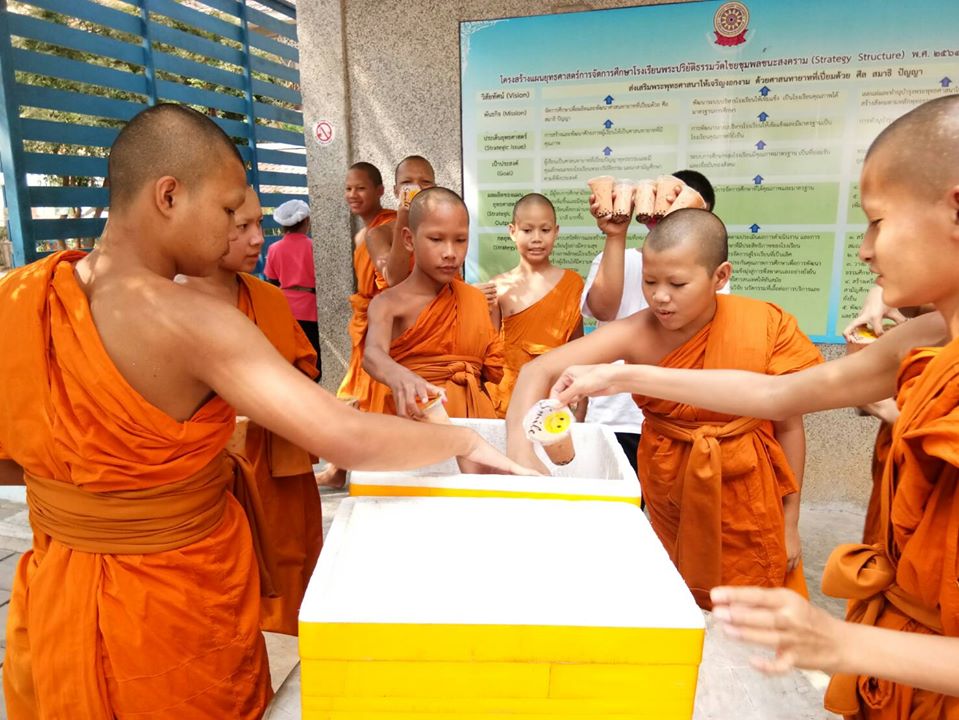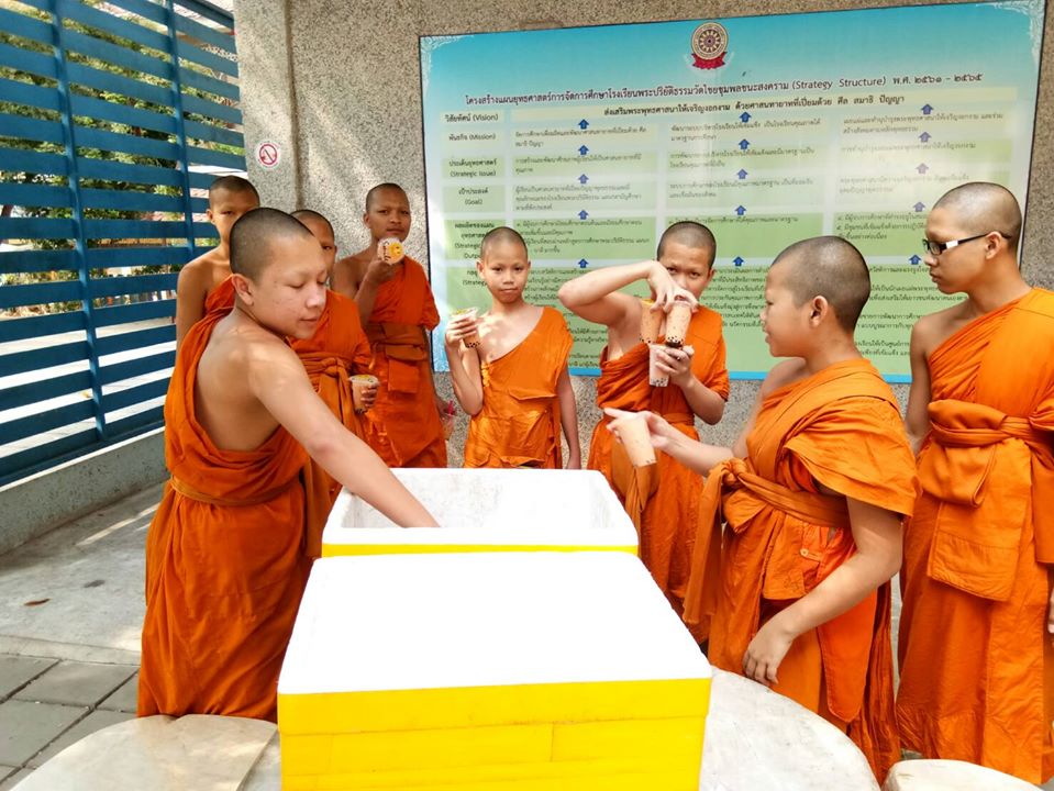ดร.พงษ์จิตต์ เกตุภู่พงษ์ ผู้จัดการโรงเรียนชัยจิตต์วิทยา นำน้ำชานมมาถวายสามเณร