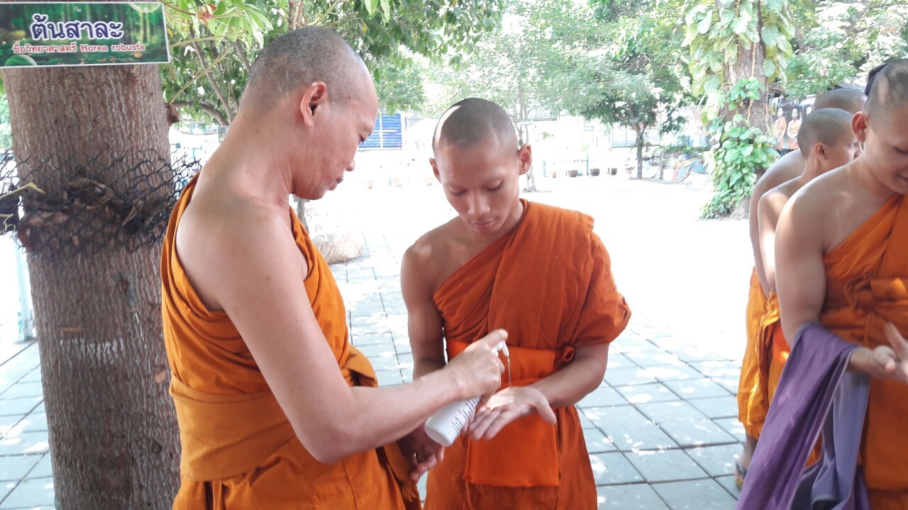 พร้อมด้วยให้สามเณรทุกรูป และคุณครูล้างมือด้วยเจลล้างมือ เพื่อป้องกันโรคติดเชื้อไวรัสโคโรนา (COCID-19) สนับสนุนโดย คุณทิพวรรณ บัวทอง และคณะนำมาถวาย 10 ขวด