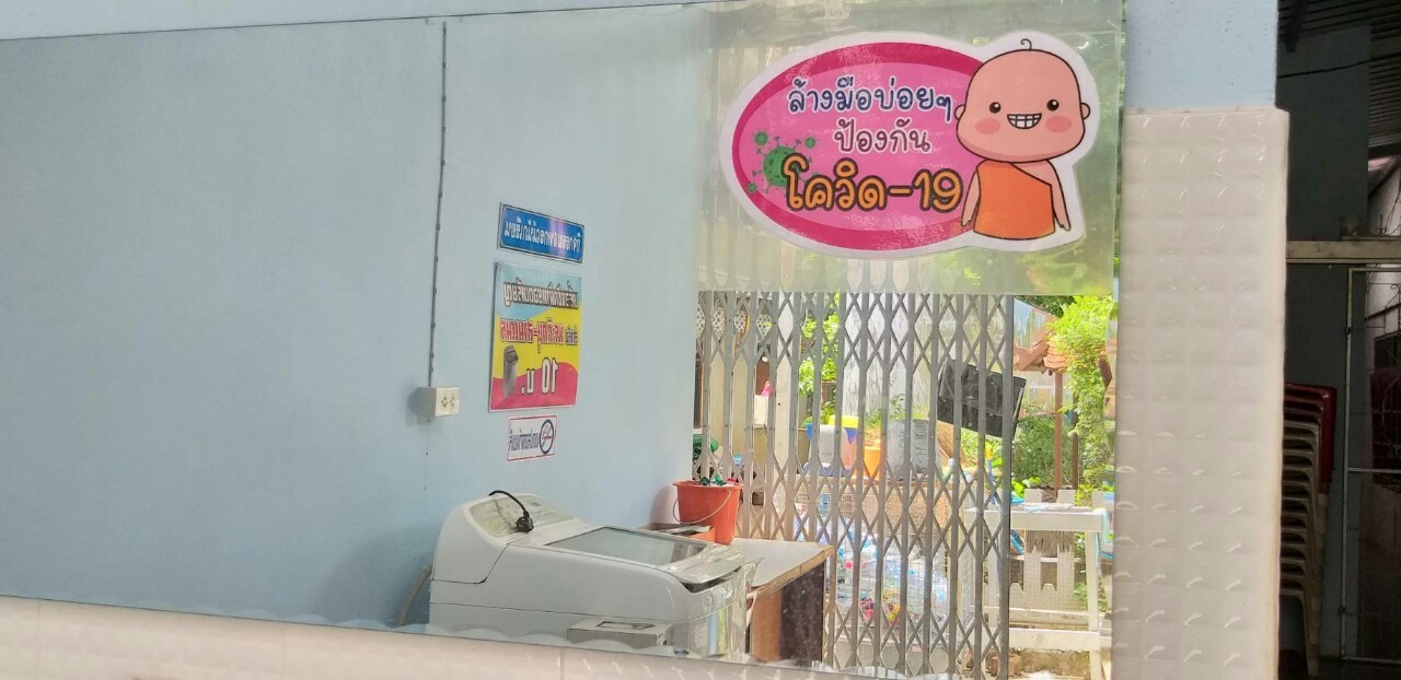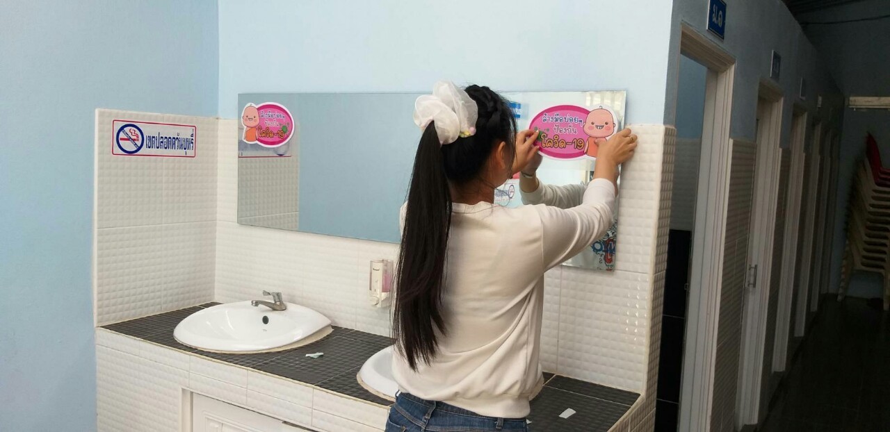 โดยการทำความสะอาดตามจุดต่างๆ พ่นแอลกอฮอลล์ตามห้องต่างๆภายในโรงเรียน จัดทำป้ายและติดป้ายตามจุดต่างๆ ได้แก่ จุดลงทะเบียน จุดล้างมือ จุดเจลแอลกอฮอลล์ รวมถึงการเว้นระยะห่างด้วยสัญลักษณ์ที่กำหนดไว้เพื่อป้งกันโควิด-19