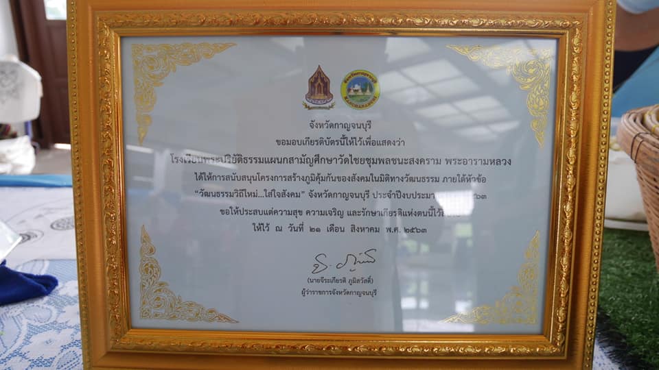 คณะสามเณร นำโดย พระครูกาญจนสุตาภรณ์ ผู้อำนวยการโรงเรียนพระปริยัติธรรมวัดไชยชุมพลชนะสงคราม ในนามชุมชนคุณธรรมต้นแบบวัดไชยชุมพลพลชนะสงคราม นำสกรีนถุงผ้า ไม้กวาด ตัดกระจก ดอกมะลิ ร่วมโครงการสร้างภูมิคุ้มกันทางสังคมในมิติทางวัฒนธรรม ภายใต้หัวข้อ "วัฒนธรรมวิถีใหม่...ใส่ใจสังคม" จังหวัดกาญจนบุรี ประจำปีงบประมาณ พ.ศ. ๒๕๖๓ โดยมีท่านสมยศ ศิลปิโยดม รองผู้ว่าราชการจังหวัดกาญจนบุรี เป็นประธาน