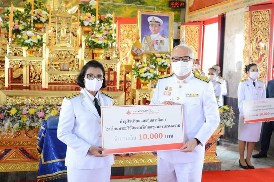 พร้อมกันนี้ รองนายกรัฐมนตรีและรัฐมนตรีว่าการกระทรวงพลังงาน ยังได้มอบทุนการศึกษา และเงินบำรุงโรงเรียนให้กับ ๕ สถานศึกษาในพื้นที่จังหวัดกาญจนบุรี ได้แก่ โรงเรียนวิสุทธรังษี ศูนย์เด็กเล็กวัดไชยชุมพลชนะสงคราม โรงเรียนอนุบาลวัดไชยชุมพลชนะสงคราม โรงเรียนพระปริยัติธรรมวัดไชยชุมพลชนะสงคราม และมหาวิทยาลัยจุฬาลงกรณราชวิทยาลัย เพื่อถวายเป็นพระราชกุศล