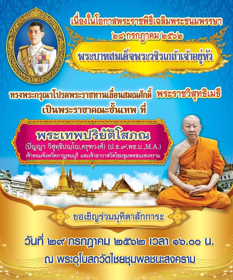 เนื่องในโอกาสพระราชพิธีเฉลิมพระชนมพรรษา ๒๘ กรกฎาคม ๒๕๖๒ พระบาทสมเด็จพระวชิรเกล้าเจ้าอยู่หัว ทรงพระกรุณาโปรดพระราชทานเลื่อนสมณศักดิ์ พระราชวิสุทธิเมธี (ปัญญา วิสุทฺธิปญฺโญ คุรฑวงศ์ ป.ธ.๙,พธ.บ.,M.A.) เจ้าคณะจังหวัดกาญจนบุรี และเจ้าอาวาสวัดไชยชุมพลชนะสงคราม พระอารามหลวง เป็นพระราชาคณะชั้นเทพ ในราชทินนามที่ : พระเทพปริยัติโสภณ