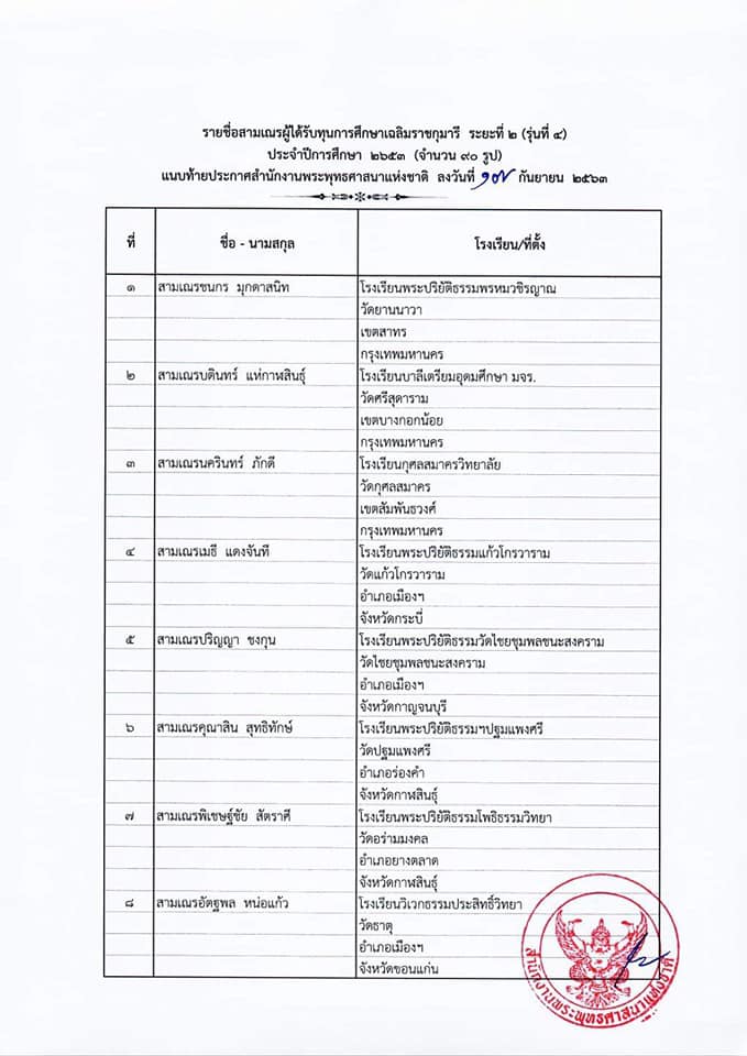 เรื่อง รายชื่อสามเณรผู้ได้รับทุนการศึกษาเฉลิมราชกุมารี ระยะที่ 2 (รุ่นที่ 4)