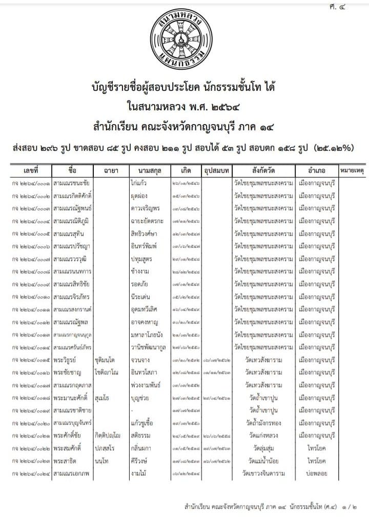 รายชื่อผู้สอบผ่านนักธรรมโท ในสนามหลวง พ.ศ.๒๕๖๔